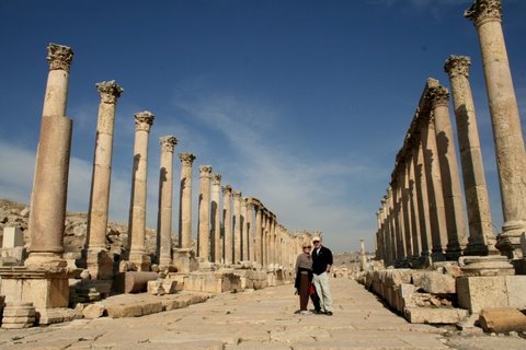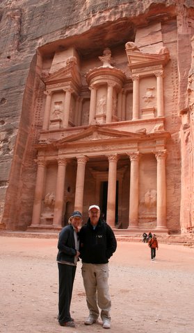 Sally and Steve in front of “The Treasury” in Petra. Steve says that the Bedouins thought that the urn at the top of the pediment contained all the gold of the pharoahs so that’s why it was called the Treasury and why they shot at it thinking they could dislodge it and steal the gold. To the right is a drawing by David Roberts, a Scottish adventurer who saw the monument in the 1800’s. Interestingly enough he did not see the pink standstone perhaps because the building was covered in dust. |