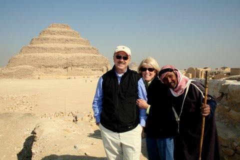 Steve and Sally with friend at Saqqara with the Step Pyramid of Pharoah Djoser in the background. This design was the inspiration for the pyramid buildng to come. This was Egypt’s first pyramid and was built to hold Pharoah Djoser’s mummified body.